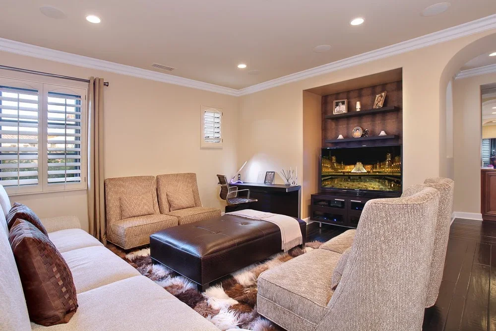 A cozy living room with beige sofas, armchair, and ottoman, a flat-screen TV, art on the walls, floral curtains, and a fireplace.